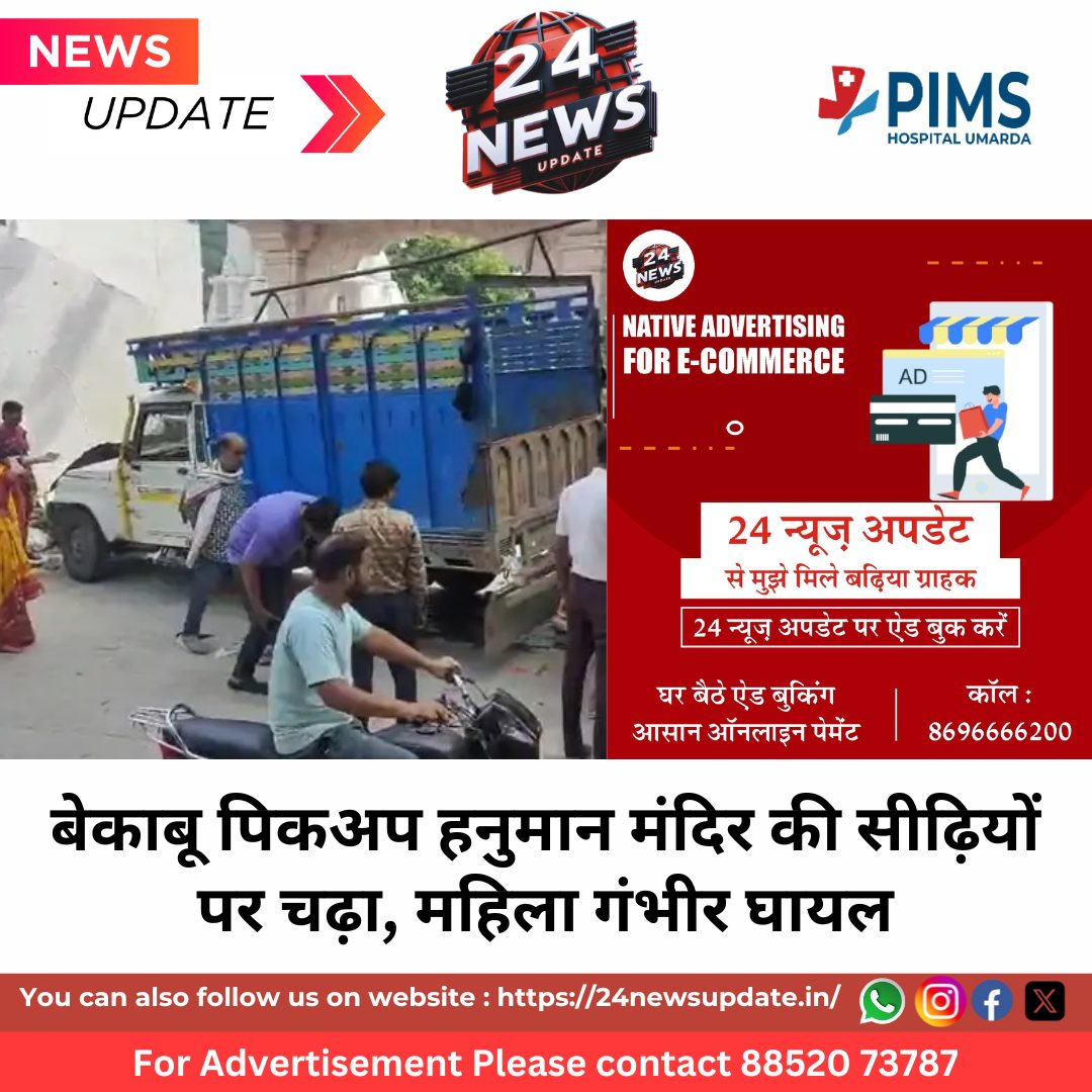 24 न्यूज अपडेट, राजसमंद। जिले के नाथद्वारा में सोमवार को बड़ा हादसा हो गया। सिंहाड़ तालाब किनारे स्थित हनुमान मंदिर के बाहर फूल-माला बेच रही महिला को बेकाबू पिकअप ने टक्कर मार दी। हादसे में महिला गंभीर रूप से घायल हो गई, वहीं मंदिर की सीढ़ियां और दीवार भी क्षतिग्रस्त हो गईं।