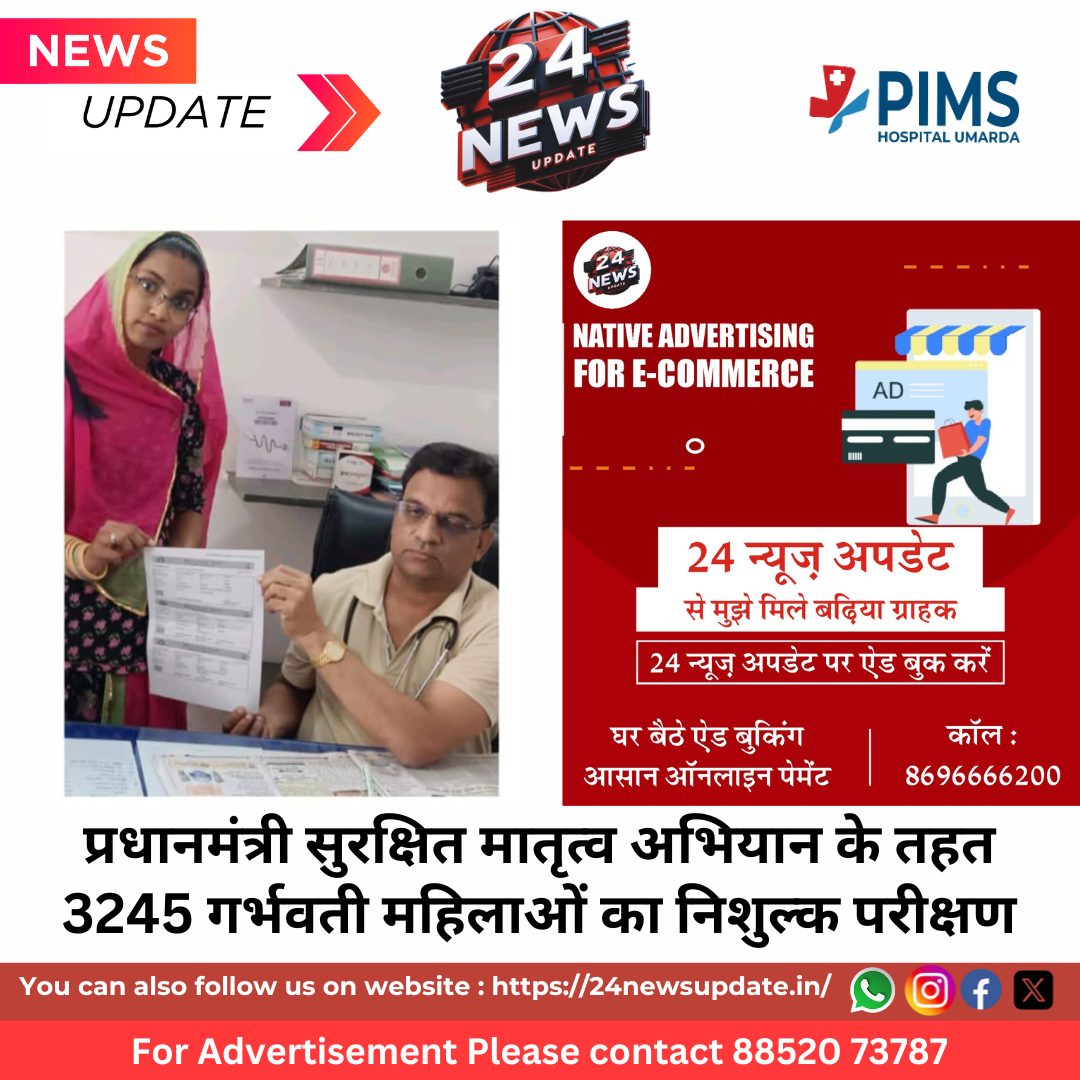 24 News Update उदयपुर, 9 अक्टूबर। मुख्य चिकित्सा एवं स्वास्थ्य अधिकारी डॉ. शंकर एच. बामनिया ने बताया कि प्रधानमंत्री सुरक्षित मातृत्व अभियान के अंतर्गत राज्यभर में 9 तारीख को आयोजित कार्यक्रम में सभी गर्भवती महिलाओं की निशुल्क जांच, परामर्श और आवश्यक दवाइयां प्रदान की गई।आज 140 चिकित्सा संस्थानों पर कुल 3245 गर्भवती महिलाओं की जाँच की गई। इस अवसर पर राज्य सरकार की मां वाउचर योजना के तहत गर्भवती महिलाओं को निशुल्क सोनोग्राफी के लिए सरकारी और पंजिकृत निजी सोनोग्राफी सेंटर पर भी भेजा गया।डॉ. बामनिया ने बताया कि हर महीने 9 तारीख को आयोजित इस अभियान में गर्भवती महिलाओं की ब्लड, यूरिन, हिमोग्लोबिन, ब्लड प्रेशर, शुगर सहित अन्य जांच निशुल्क की जाती है। संभावित और उच्च जोखिम वाली गर्भवती महिलाओं को चिन्हित कर उच्च चिकित्सा संस्थानों पर भेजा जाता है, ताकि प्रसव के दौरान किसी भी जटिलता से बचा जा सके।साथ ही महिलाओं को स्तनपान, पोषण, टीकाकरण, पोषक आहार, आयरन और कैल्शियम विटामिन लेने के लिए जागरूक किया गया। अभियान का उद्देश्य सुरक्षित मातृत्व सुनिश्चित करना और माताओं तथा शिशुओं के स्वास्थ्य को बेहतर बनाना है। Share this: Share on X (Opens in new window) X Share on Facebook (Opens in new window) Facebook More Email a link to a friend (Opens in new window) Email Share on WhatsApp (Opens in new window) WhatsApp Like this:Like Loading... Related Discover more from 24 News Update Subscribe to get the latest posts sent to your email. Type your email… Subscribe Post navigation सांसद रावत ने रस्साकशी में आजमाए हाथ टोबेको फ्री यूथ कैम्पेन 3.0 उदयपुर में हुआ शुरू