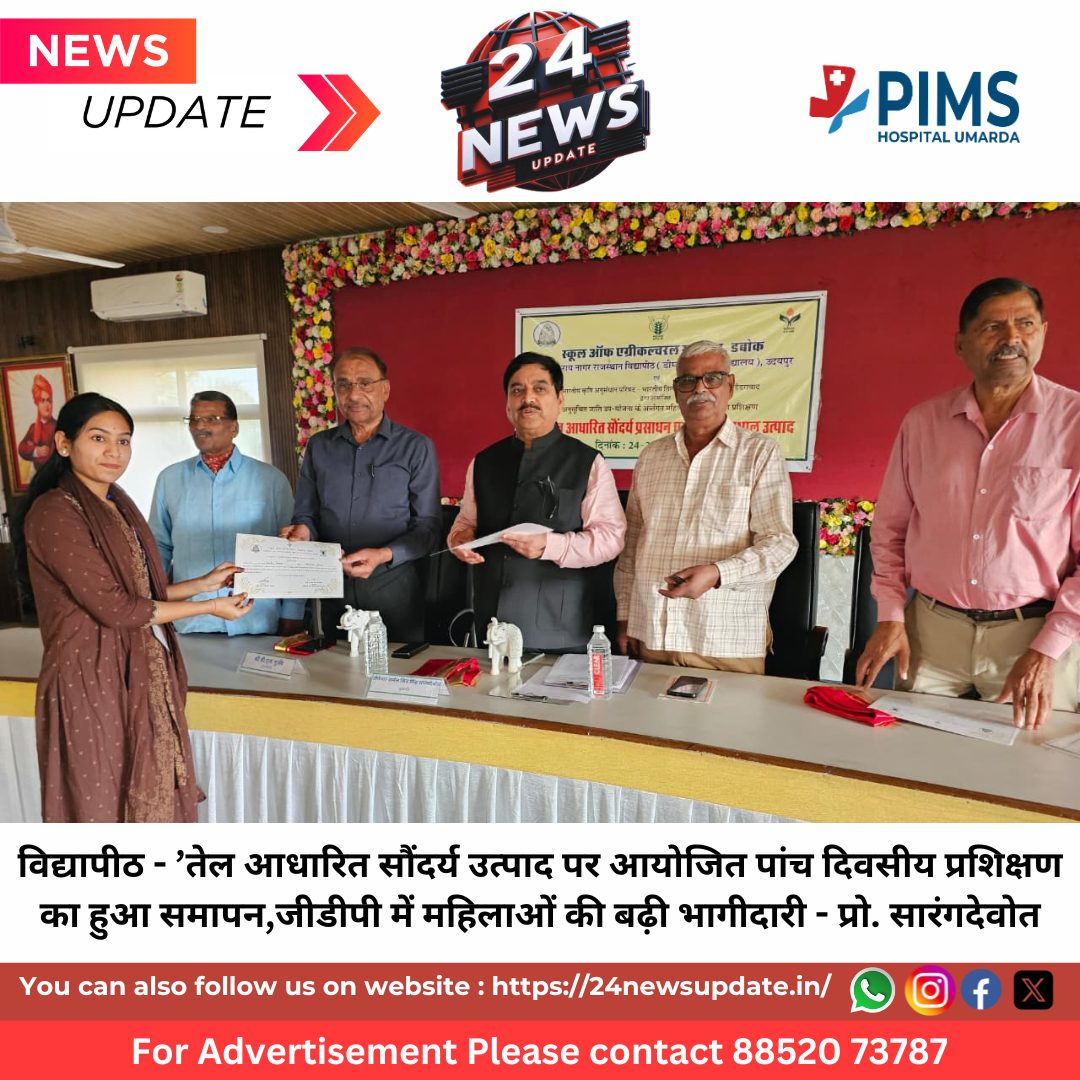 24 News Update उदयपुर. राजस्थान विद्यापीठ के संघटक एग्रीेल्चर महाविद्यालय के कृषि भवन के सभागार में महिलाओं के लिए आयोजित पाँच दिवसीय “तेल आधारित सौंदर्य एवं त्वचा देखभाल उत्पाद निर्माण” उद्यमिता प्रशिक्षण कार्यक्रम का समापन हुआ। प्रारंभ में नोडल अधिकारी एवं कृषि सलाहकार प्रो. इन्द्रजीत माथुर ने अतिथियों का स्वागत करते हुए बताया कि यह प्रशिक्षण कार्यक्रम आईआईओआर – आईसीएआर के अनुसूचित जाति उपयोजना परियोजना के अंतर्गत प्रायोजित है। पाँच दिनों में प्रशिक्षार्थियों को सरसों, कुसुम, सूरजमुखी और अलसी के तेल पर आधारित विभिन्न उत्पादोंकृफेस सीरम, हेयर मास्क, डी-टैन पैक, गुलाब जल सीरम, हेयर ऑयल, ड्राई फेस पैक, स्किन एक्सफोलिएटर स्क्रब आदिकृके निर्माण का व्यावहारिक प्रशिक्षण दिया गया। विशेषज्ञों ने निर्माण प्रक्रिया के साथ गुणवत्ता, पैकेजिंग और विपणन के पहलुओं पर भी विस्तार से मार्गदर्शन प्रदान किया। मुख्य अतिथि कुलाधिपति भंवर लाल गुर्जर ने कहा कि शिक्षा तभी सार्थक होती है जब वह जीवन और आजीविका से जुड़ती है। उन्होंने कहा कि ग्रामीण और अर्धशहरी क्षेत्रों की महिलाएं यदि कृषि आधारित संसाधनों से मूल्यवर्धित उत्पाद तैयार करें, तो वे न केवल अपने परिवार की आर्थिक स्थिति सुदृढ़ कर सकती हैं, बल्कि स्थानीय स्तर पर रोजगार के अवसर भी सृजित कर सकती हैं। उन्होंने प्रशिक्षार्थियों से आग्रह किया कि वे प्रशिक्षण में सीखे गए कौशल को व्यवहार में उतारें और आत्मनिर्भरता की दिशा में ठोस कदम बढ़ाएं। अध्यक्षता करते हुए कुलपति प्रो. शिव सिंह सारंगदेवोत ने कहा कि भारत के स्टार्ट-अप पारितंत्र में महिलाओं की भूमिका निरंतर बढ़ रही है। देश में 50 प्रतिशत जनसंख्याॅ महिलाओं की है लेकिन उन्हें पुरूष की तुलना में उन्हें हर क्षेत्र में कम अवसर प्रदान किये जाते है। हमारी जीडीपी में महिलाओं का योगदान 18 से 25 प्रतिशत ही है। 2017-18 में श्रम रोजगार में 23 प्रतिशत था जो 2023-24 में बढकर यह 41.07 हो गया है। आज हर महिला आत्म निर्भर बनना चाहती है लेकिन जरूरत है उन्हें अवसर देने की। देश की महिलाएॅ शिक्षित हो रही है। सौंदर्य उद्योग उपभोक्ता वस्तु क्षेत्र का एक महत्वपूर्ण भाग है, जिसमें नवाचार और गुणवत्ता के लिए अपार संभावनाएं हैं। उन्होंने विश्वास व्यक्त किया कि यह प्रशिक्षण महिलाओं को उद्यमिता की ओर प्रेरित करेगा और विश्वविद्यालय समाज के विभिन्न वर्गोंकृविशेषकर युवाओं, बालिकाओं और वंचित समूहोंकृको तकनीकी ज्ञान देकर सशक्त बनाने के अपने संकल्प पर निरंतर अग्रसर रहेगा। अधिष्ठाता प्रो. गजेन्द्र कुमार माथुर ने अतिथियों के प्रति आभार व्यक्त करते हुए कहा कि ऐसे प्रशिक्षण कार्यक्रम क्षेत्र की महिलाओं के लिए नए अवसरों के द्
