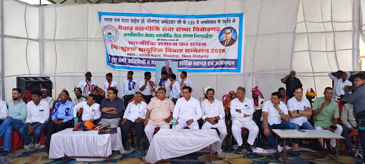 24 News Update निंबाहेड़ा (कविता पारख)। भारत रत्न बाबा साहेब डॉ. भीमराव अंबेडकर जी की 135वीं जयंती के उपलक्ष्य में मेवाड़ वाल्मीकि सेवा संस्था, चित्तौड़गढ़ एवं प्रगतिशील मेवाड़ वाल्मीकि सेवा संस्था, निंबाहेड़ा के तत्वावधान में वाल्मीकि समाज का प्रथम निःशुल्क सामूहिक विवाह सम्मेलन 2026 का भव्य आयोजन दशहरा मैदान, निंबाहेड़ा में किया गया। कार्यक्रम में बड़ी संख्या में समाजजन, अतिथिगण एवं गणमान्य नागरिक उपस्थित रहे।सम्मेलन का उद्देश्य समाज में एकता, समरसता को बढ़ावा देना एवं सामाजिक कुरीतियों को समाप्त कर सादगीपूर्ण विवाह परंपरा को प्रोत्साहित करना रहा। इस अवसर पर विवाह बंधन में बंधे नवदंपतियों को आशीर्वाद देते हुए वक्ताओं ने कहा कि ऐसे सामूहिक आयोजन सामाजिक समरसता को मजबूत करने के साथ-साथ आर्थिक बोझ को भी कम करते हैं।समारोह में भारतीय जनता पार्टी के प्रदेश उपाध्यक्ष हकरु भाई मईडा (मीणा), पूर्व यूडीएच मंत्री एवं विधायक श्रीचंद कृपलानी (मुख्य अतिथि), भाजपा जिला प्रभारी विमल अग्रवाल (जयपुर), भाजपा जिला अध्यक्ष रतनलाल गाडरी, पूर्व विधायक अशोक नवलखा, निवर्तमान जिला प्रमुख गब्बर सिंह अहीर, निवर्तमान प्रधान बगदीराम धाकड़, सीपी नामधारणी, पूर्व नगर अध्यक्ष नितिन चतुर्वेदी, नगर अध्यक्ष कपिल चौधरी, पूर्वी नगर अध्यक्ष अशोक जाट, पश्चिमी मंडल अध्यक्ष राजेंद्र सिंह शक्तावत, नगर महामंत्री देवकरण समदानी, कमलेश बुनकर, ग्रामीण मंडल महामंत्री राधेश्याम टेलर सहित अनेक भाजपा पदाधिकारी एवं जनप्रतिनिधि उपस्थित रहे। सभी अतिथियों ने नवदंपति जोड़ों को सुखद दांपत्य जीवन की शुभकामनाएं दीं।इस अवसर पर समाज के वरिष्ठ पदाधिकारियों द्वारा अतिथियों का उपरना ओढ़ाकर एवं मेवाड़ी परंपरानुसार साफा बंधवाकर आत्मीय स्वागत एवं अभिनंदन किया गया।मुख्य अतिथि विधायक श्रीचंद कृपलानी ने अपने विस्तृत उद्बोधन में कहा कि सामूहिक विवाह सम्मेलन केवल एक आयोजन नहीं, बल्कि समाज को नई दिशा देने वाला सशक्त माध्यम है। उन्होंने कहा कि वर्तमान समय में विवाह में बढ़ते दिखावे और अनावश्यक खर्च से मध्यम एवं कमजोर वर्ग के परिवारों पर आर्थिक दबाव बढ़ता है, जबकि ऐसे निःशुल्क सामूहिक विवाह सम्मेलन इस बोझ को कम कर समाज के सामने एक आदर्श प्रस्तुत करते हैं।उन्होंने कहा कि सामाजिक स्तर पर इस प्रकार के आयोजन आपसी भाईचारे, एकता और समरसता को मजबूत करते हैं तथा दहेज प्रथा, फिजूलखर्ची और आडंबर जैसी कुरीतियों पर प्रभावी रोक लगाने में सहायक सिद्ध होते हैं। यह पहल समाज को सकारात्मक सोच की ओर अग्रसर करती है और समानता एवं सहयोग की भावना को बढ़ाती है।विधायक कृपलानी ने शिक्षा, संस्कार और सामाजिक जागरूकता को समाज की प्रगति का आधार बताते ह