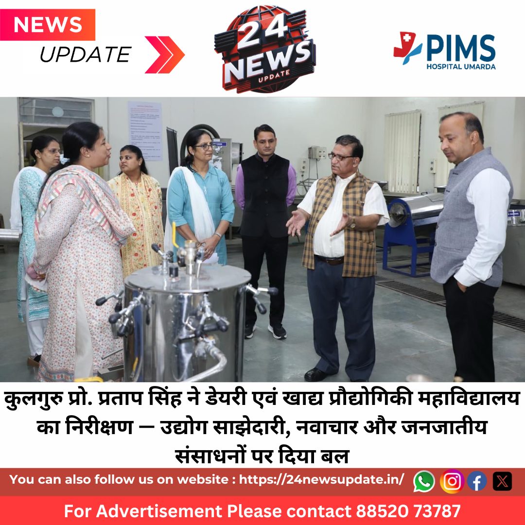 24 News Update उदयपुर। महाराणा प्रताप कृषि एवं प्रौद्योगिकी विश्वविद्यालय, उदयपुर के कुलगुरु प्रोफेसर प्रताप सिंह ने बुधवार को विश्वविद्यालय के डेयरी एवं खाद्य प्रौद्योगिकी महाविद्यालय का निरीक्षण किया। इस दौरान उन्होंने विभागीय प्रयोगशालाओं, प्रसंस्करण इकाइयों और शिक्षण सुविधाओं का अवलोकन करते हुए छात्रों और शिक्षकों को शैक्षणिक तथा शोध उन्नयन के लिए महत्वपूर्ण दिशा-निर्देश दिए।कुलगुरु ने कहा कि महाविद्यालय में उपलब्ध टमाटर, आइसक्रीम और बेकरी प्रसंस्करण इकाइयों का उपयोग अब केवल शिक्षण तक सीमित न रहकर उद्योग साझेदारी, राजस्व सृजन और स्टार्ट-अप संवर्धन के लिए किया जाना चाहिए, ताकि विद्यार्थी प्रत्यक्ष रूप से बाज़ार और उद्योग की मांगों को समझते हुए सीख सकें।जनजातीय उत्पादों पर शोध को दी प्राथमिकताप्रो. सिंह ने अनुसंधान गतिविधियों में जनजातीय क्षेत्रों में उपलब्ध अल्प-उपयोगी फल, सब्ज़ियों एवं दलहनों जैसे तिमरू, फालसा, जामुन और सोयाबीन पर विशेष अध्ययन और वैल्यू एडिशन की आवश्यकता बताई। उन्होंने कहा कि स्थानीय संसाधनों पर आधारित उत्पाद विकास से इन फलों को बाज़ार में पहचान मिलेगी, जनजातीय उत्पादकों को बेहतर मूल्य प्राप्त होगा और एफपीओ एवं स्वयं सहायता समूहों के माध्यम से ग्रामीण रोजगार व उद्यमिता को बढ़ावा मिलेगा।उन्होंने यह भी सुझाव दिया कि अनुसंधान में प्राकृतिक और स्वास्थ्यवर्धक अवयवों को प्राथमिकता दी जाए और कृत्रिम स्वीटनरों पर निर्भरता कम की जाए। प्रयोगशालाओं और डिजिटल शिक्षा पर जोरनिरीक्षण के दौरान कुलगुरु ने रसायन विज्ञान और सूक्ष्मजीव विज्ञान विभागों का भी अवलोकन किया। उन्होंने प्रयोगशालाओं के उन्नयन हेतु आधुनिक उपकरणों और उच्चस्तरीय सुरक्षा सुविधाओं से युक्त नई परियोजनाओं के प्रस्ताव तैयार करने के निर्देश दिए।साथ ही उन्होंने विद्यार्थियों को वैश्विक ज्ञान संसाधनों से जोड़ने के लिए डिजिटल लाइब्रेरी और ई-लर्निंग प्लेटफॉर्म को और अधिक सशक्त बनाने की आवश्यकता पर बल दिया। ग्रामीण युवाओं को उद्यमिता से जोड़ने की दिशा में पहलकुलगुरु ने कहा कि महाविद्यालय के कौशल विकास कार्यक्रमों में जनजातीय बेल्ट के ग्रामीण युवाओं को खाद्य प्रसंस्करण, विपणन कौशल और उद्यम प्रबंधन प्रशिक्षण से जोड़ा जाए, ताकि वे स्वयं के स्टार्ट-अप स्थापित कर समुदाय के आर्थिक विकास में योगदान दे सकें।अपने दौरे के समापन पर प्रो. सिंह ने विश्वास व्यक्त किया कि डेयरी एवं खाद्य प्रौद्योगिकी महाविद्यालय शीघ्र ही नवाचार, अनुसंधान, उद्योग सहयोग और सामाजिक विकास के क्षेत्र में एक उत्कृष्ट मॉडल संस्थान के रूप में स्थापित होगा।यह जानकारी डॉ. जी. एल. मीना, मीडिया प्रकोष्ठ एवं ज
