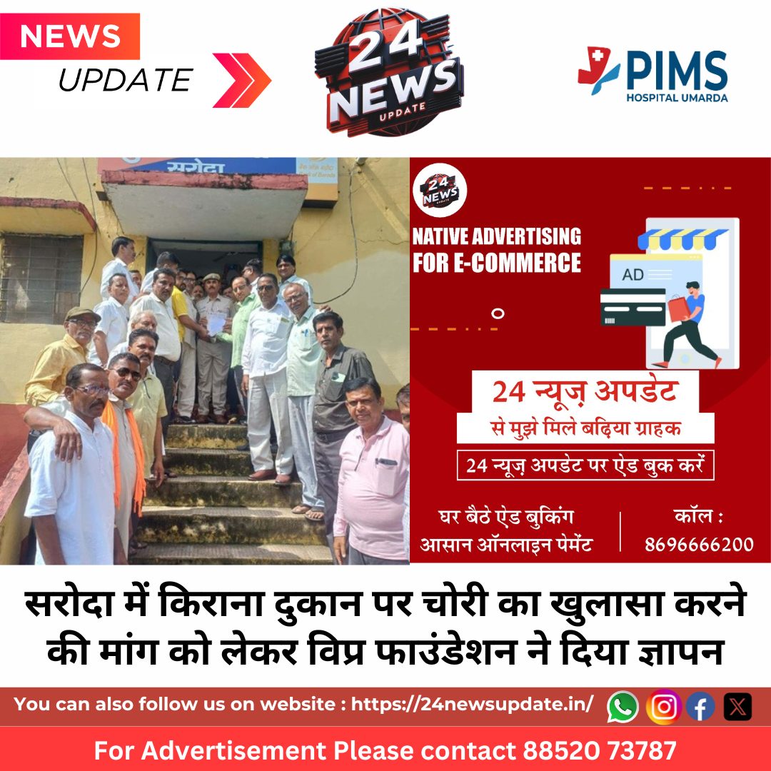 24 News Update सागवाड़ा (जयदीप जोशी)। नगर के निकट्वर्ती सरोदा कस्बे के बस स्टैंड पर स्थित किराना व्यापारी की दुकान पर हाल ही में हुई बड़ी चोरी की वारदात का शीघ्र खुलासा करने की मांग को लेकर विप्र फाउंडेशन ने सरोदा थाना पहुंचकर थाना अधिकारी के नाम ज्ञापन दिया।