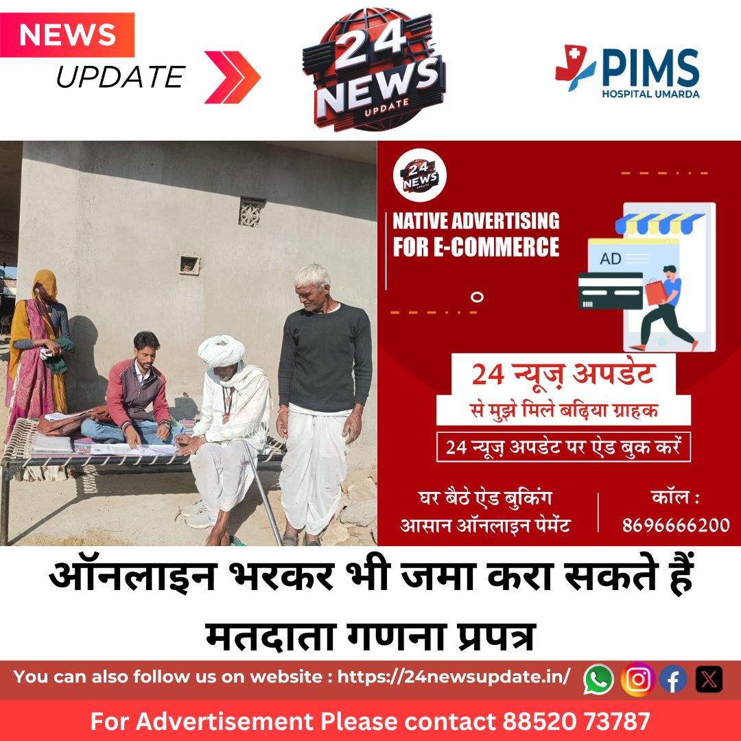24 news Update उदयपुर। मतदाता सूचियों के विशेष गहन पुनरीक्षण (एसआईआर) कार्यक्रम के अन्तर्गत मतदाता गणना प्रपत्र ऑनलाइन भरकर भी जमा करा सकते हैं। भारत निर्वाचन आयोग ने मतदाताओं को गणना प्रपत्र भरने के लिए ऑनलाइन माध्यम का उपयोग करने की भी सुविधा दी है। ऑनलाइन आवेदन के लिए voters.eci.gov.in वेबसाइट पर फॉर्म भरने की सुविधा उपलब्ध है। मतदाता केवल खुद अपने लिए ही ऑनलाइन गणना प्रपत्र भर सकता है। इसके लिए मतदाता पहचान पत्र और आधार कार्ड का उपयोग करने वाले ई-हस्ताक्षर उपकरण पर मतदाता का नाम बिल्कुल एक जैसा होना चाहिए। इस प्रक्रिया में आगे बढ़ने के लिए मतदाता का मोबाइल नंबर मतदाता पहचान पत्र से लिंक होना जरूरी है। अपना गणना प्रपत्र ऑनलाइन जमा करने वाले मतदाता को बीएलओ द्वारा दिया जाने वाला फॉर्म भरने की आवश्यकता नहीं है।