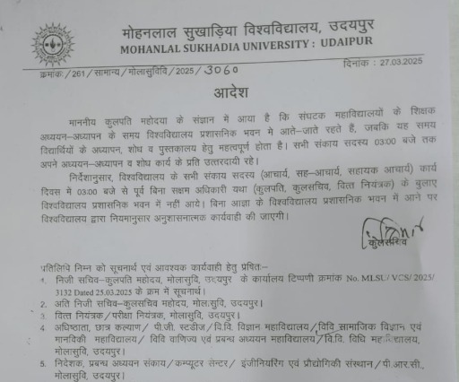 24 न्यूज अपडेट उदयपुर। मोहनलाल सुखाड़िया विश्वविद्यालय में एक आदेश चर्चा का विषय बना हुआ है। इसमें बताया गया है कि कुलपति महोदया के संज्ञान में आया है कि संघटक महाविद्यालयों के शिक्षक अध्ययन-अध्यापन के समय विश्वविद्यालय प्रशासनिक भवन में आते-जाते रहते हैं, जबकि यह समय विद्यार्थियों के अध्यापन, शोध व पुस्तकालय हेतु महत्वपूर्ण होता है। सभी संकाय सदस्य 03ः00 बजे तक अपने अध्ययन-अध्यापन व शोध कार्य के प्रति उत्तरदायी रहे। निर्देशानुसार, विश्वविद्यालय के सभी संकाय सदस्य (आचार्य, सह-आचार्य, सहायक आचार्य) कार्य दिवस में 3 बजे से पूर्व बिना सक्षम अधिकारी यथा (कुलपति, कुलसचिव, वित्त नियंत्रक) के बुलाए विश्वविद्यालय प्रशासनिक भवन में नहीं आये। बिना आज्ञा के विश्वविद्यालय प्रशासनिक भवन में आने पर विश्वविद्यालय द्वारा नियमानुसार अनुशासनात्मक कार्यवाही की जाएगी। Share this: Share on X (Opens in new window) X Share on Facebook (Opens in new window) Facebook More Email a link to a friend (Opens in new window) Email Share on WhatsApp (Opens in new window) WhatsApp Like this:Like Loading... Related Discover more from 24 News Update Subscribe to get the latest posts sent to your email. Type your email… Subscribe Post navigation ग्रो ग्रीन के संकल्प को साधने हुई विशेष कार्यशाला, विद्यार्थियों, कलाकारों और प्रबुद्धजनों ने जताया जल व पर्यावरण संरक्षण का संकल्प अब 48 गांव निगम क्षेत्र में हुए सम्मिलित।निगम ने पूरा किया 80 वार्डों का सर्वे